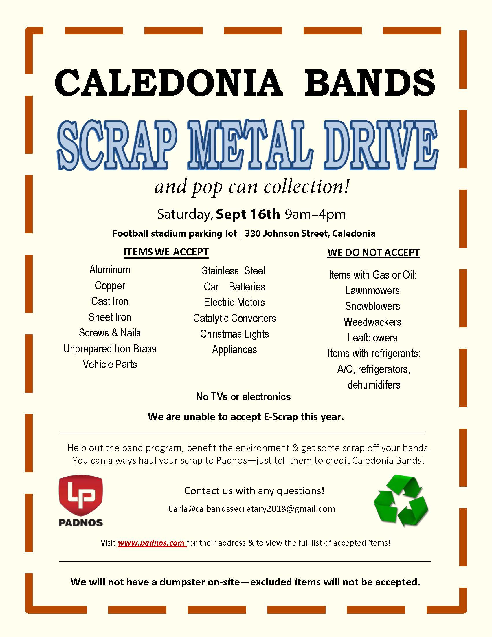 -Saturday September 16 - Scrap Metal Drive! See attached flyer for all details. Also look for a volunteer sign-up email soon!